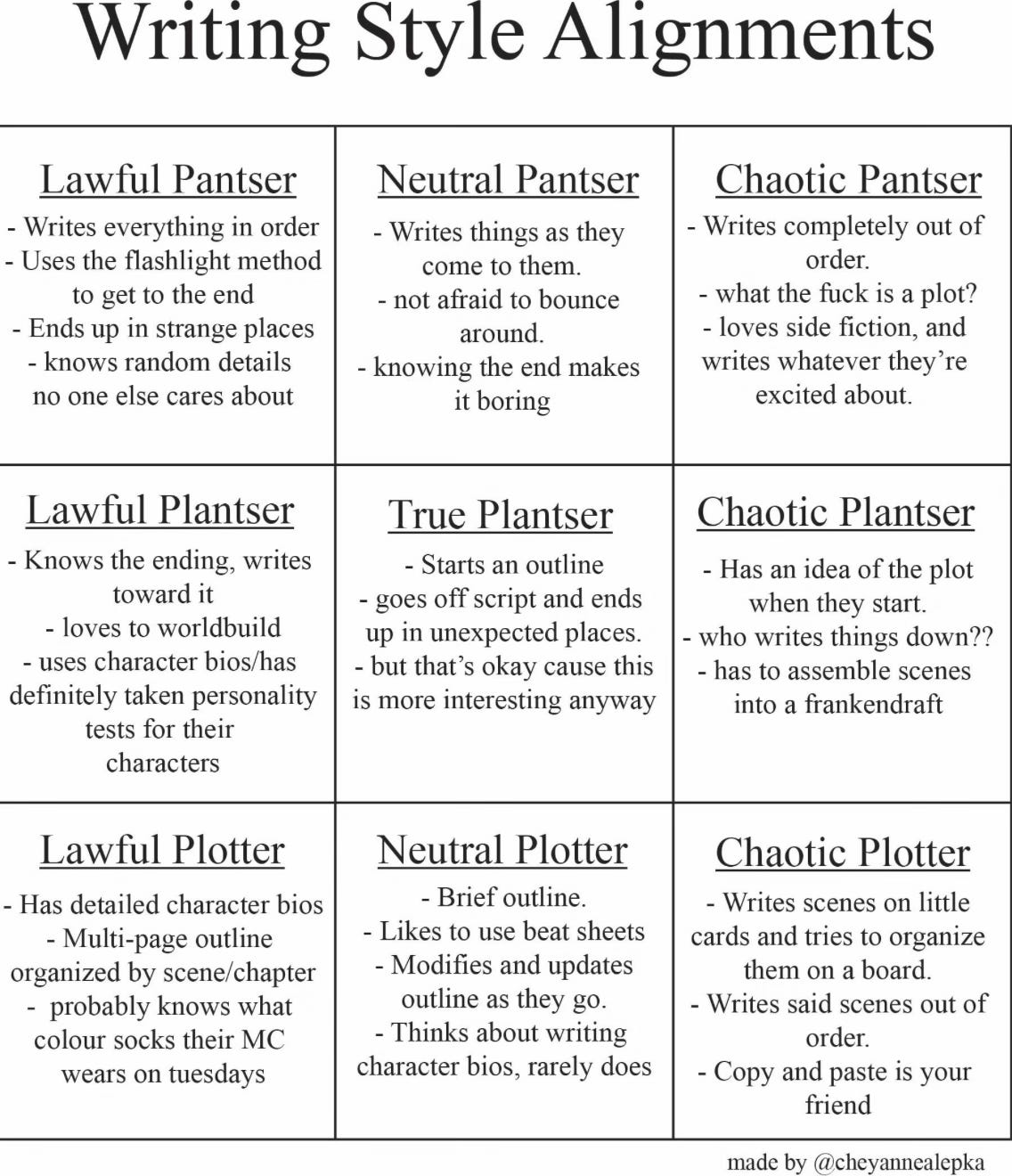 I won't go into details here. In any case, most people know what these mean. Either someone who plans and outlines everything, or someone who kind of lets writing lead them to the end.