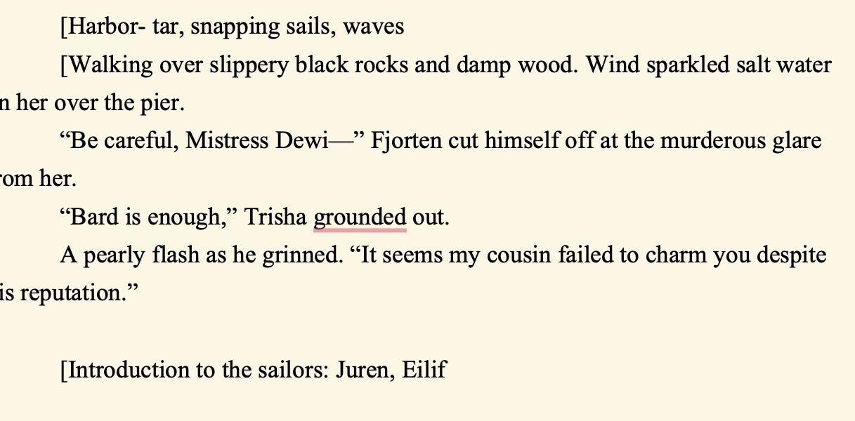 I didn’t make big changes. Those come after I’ve finalized the whole manuscript and gotten my alpha/beta-reader feedback. What I did add instead was more sensory descriptions and smoothing the interaction between Trisha and Fjorten (lol, at least I hope so).